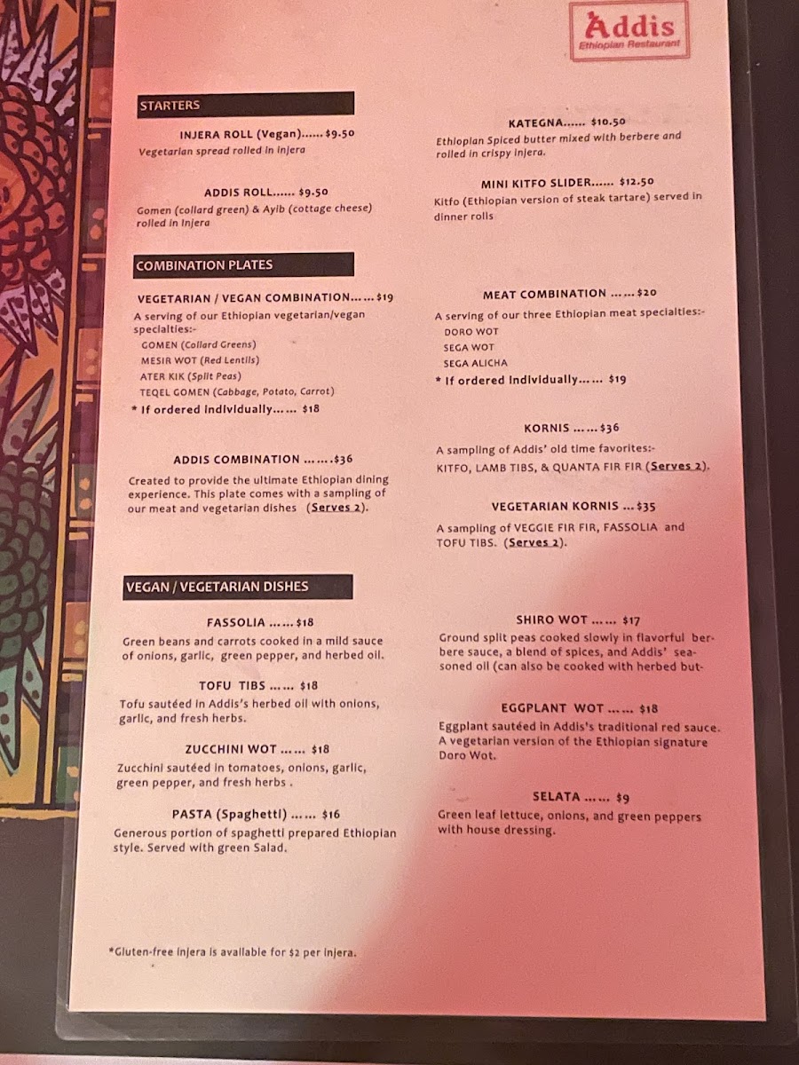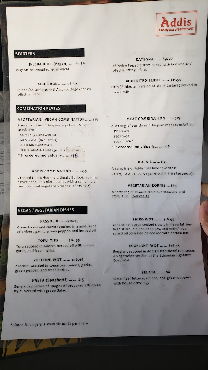 Addis offers a menu that invites you to explore the rich flavors of Ethiopian cuisine in a relaxed, unpretentious setting. Whether you're stopping by for a casual lunch or settling in for an intimate dinner, the menu presents a balance of comforting dishes and vibrant spices, reflecting a thoughtful blend of tradition and local influences.